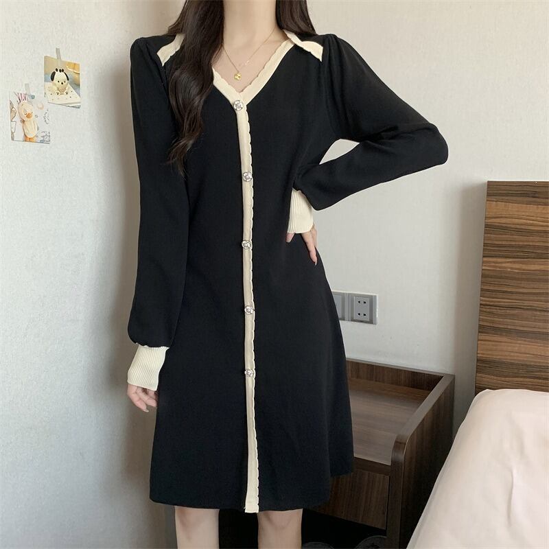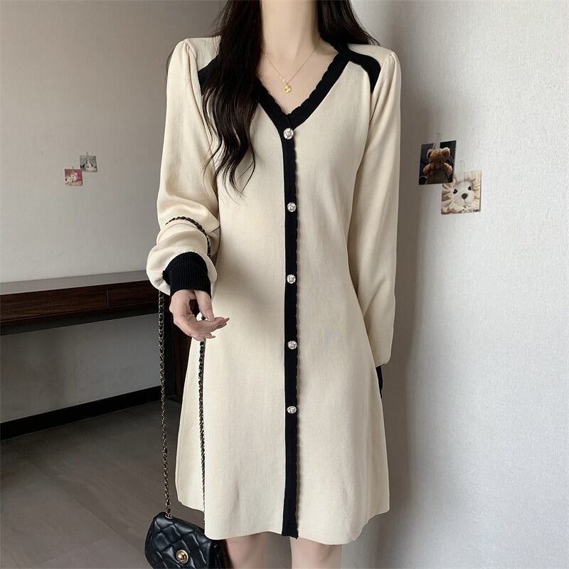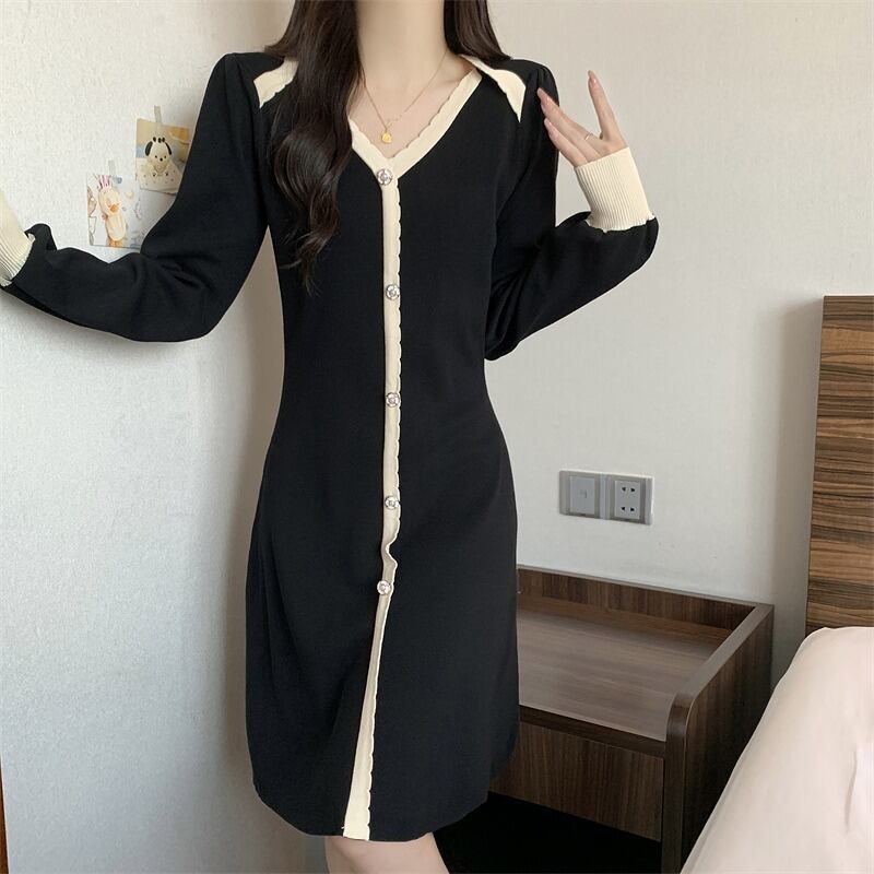 ニットワンピース 厚手 フリル 長袖 バイカラー スリム 着痩せ カットソー シンプル カットソー 羽織り 配色
