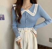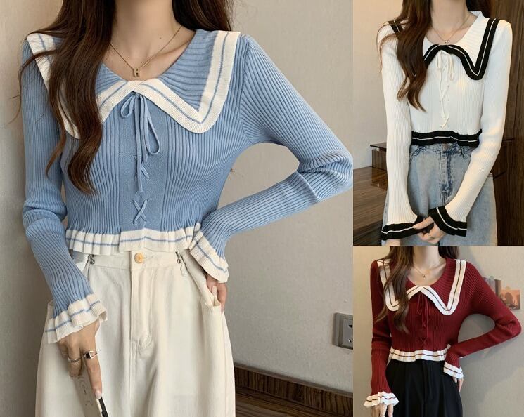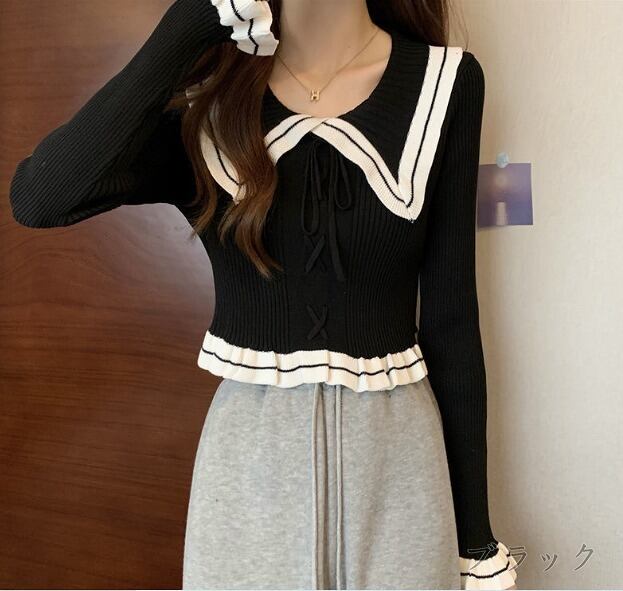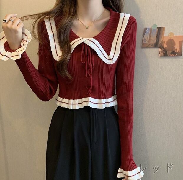 ニット ショット丈 長袖 バイカラー フリル カットソー sweet系 カットソー 羽織り トップス 配色