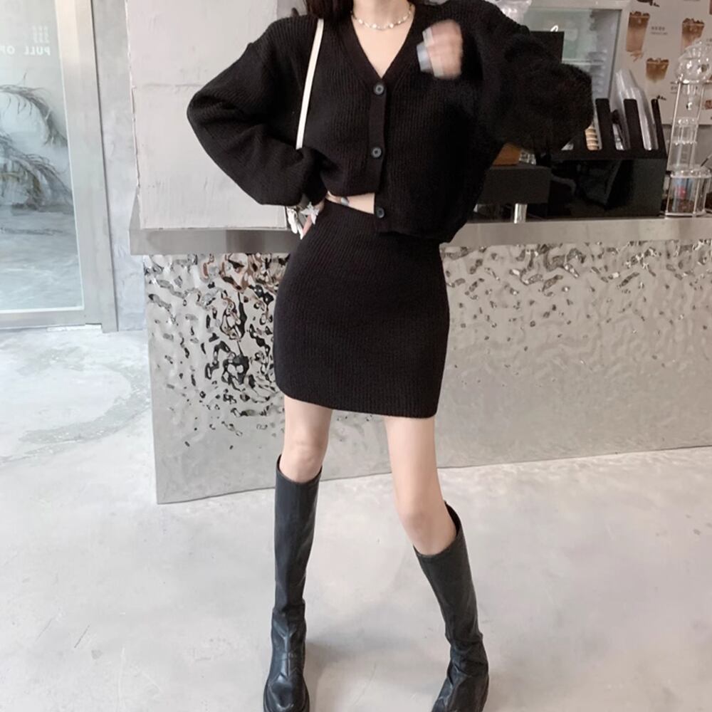 ニットアンサンブル リブ編みニットカーディガン ショート丈 Vネックトップス 長袖 ニットスカート ミニスカートセクシー