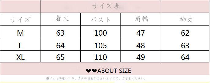 商品画像に記載 M着丈約56 バスト約92 肩幅約43 袖丈約51(OK)L着丈約58 バスト約96 肩幅約45 袖丈約53(OK)XL着丈約60 バスト約100 肩幅約47.5 袖丈約55(OK)