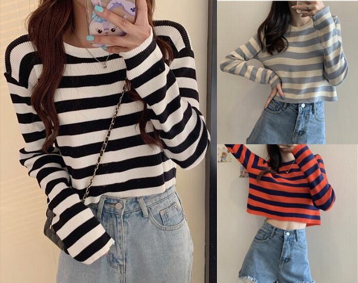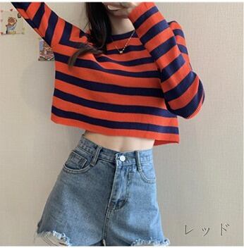 ニット 長袖 切り替え バイカラー ショット丈 カットソー ボーダー柄 シンプル カジュアル カットソー 羽織り トップス 配色 ストライプ柄 ライン