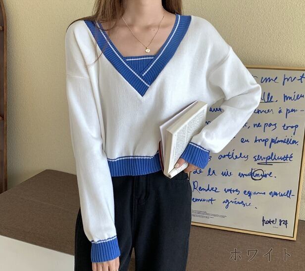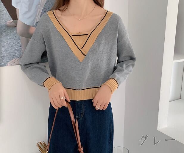 ニット ショット丈 フェイク 切り替え バイカラー カットソー sweet系 カットソー 羽織り トップス レイヤード 重ね着風 配色