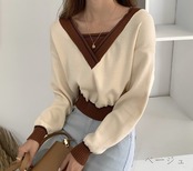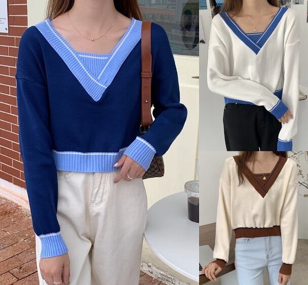 全5色 ニット ショット丈 フェイク 切り替え バイカラー カットソー sweet系