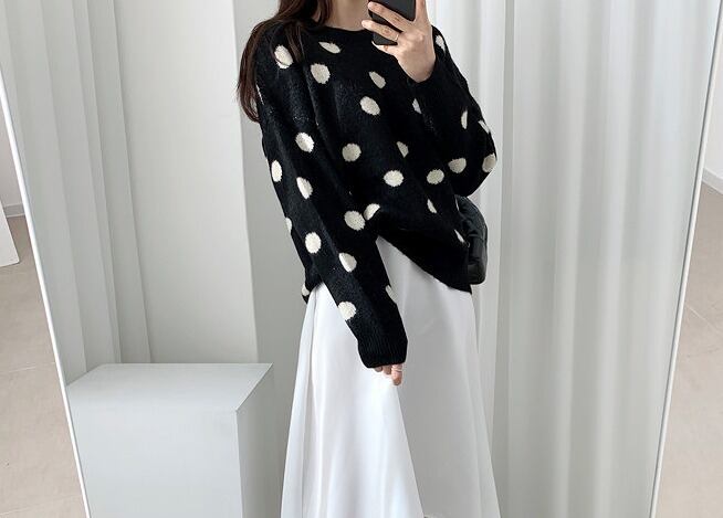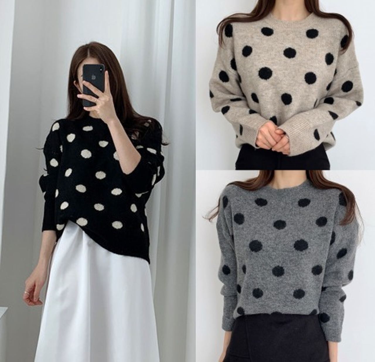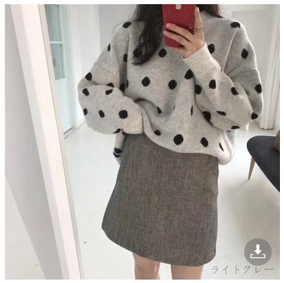ニット 厚手 長袖 バイカラー 体型カバー 着痩せ カットソー ドット柄 シンプル カジュアル カットソー 羽織り トップス 配色 水玉