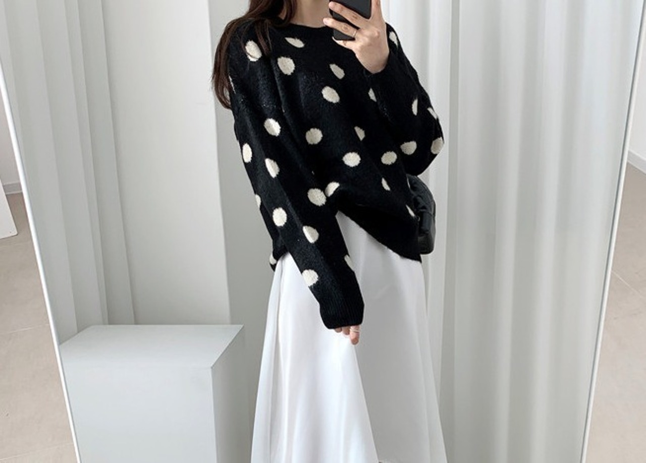 全4色 ニット 厚手 長袖 バイカラー 体型カバー 着痩せ カットソー ドット柄 シンプル カジュアル