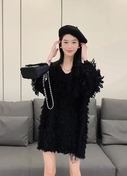 全2色 ニット 厚手 フリンジ 長袖 体型カバー 着痩せ sweet系