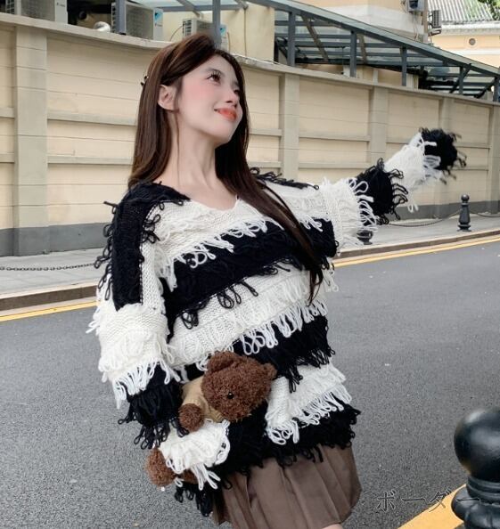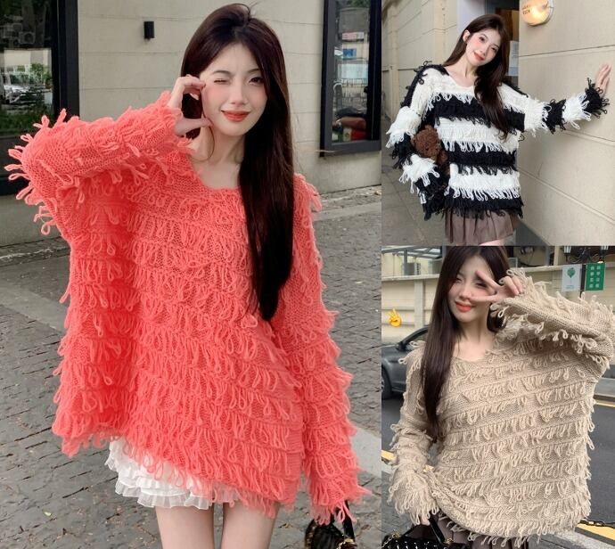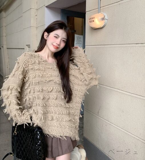全3色 ニット 厚手 フリンジ 長袖 体型カバー 着痩せ sweet系