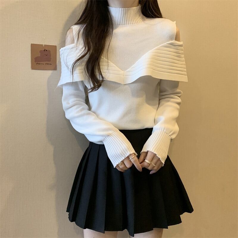 全2色 ニット 長袖 フリル 体型カバー 着痩せ オフショルダー カットソー sweet系
