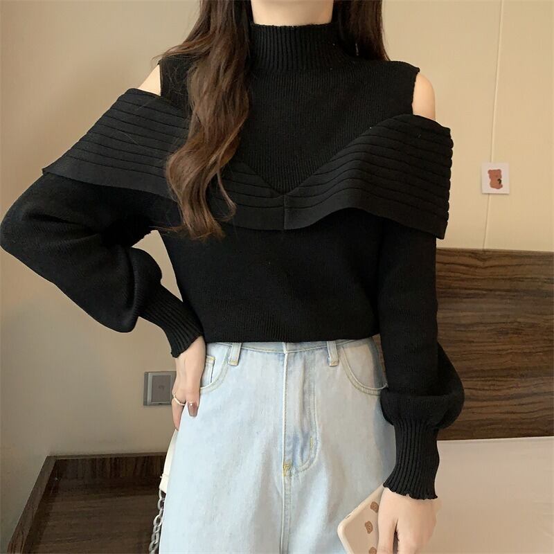 ニット 長袖 フリル 体型カバー 着痩せ オフショルダー カットソー sweet系 カットソー 羽織り トップス 肩あき 肩出し 肩見せ