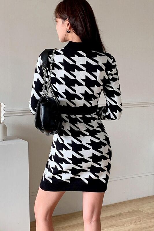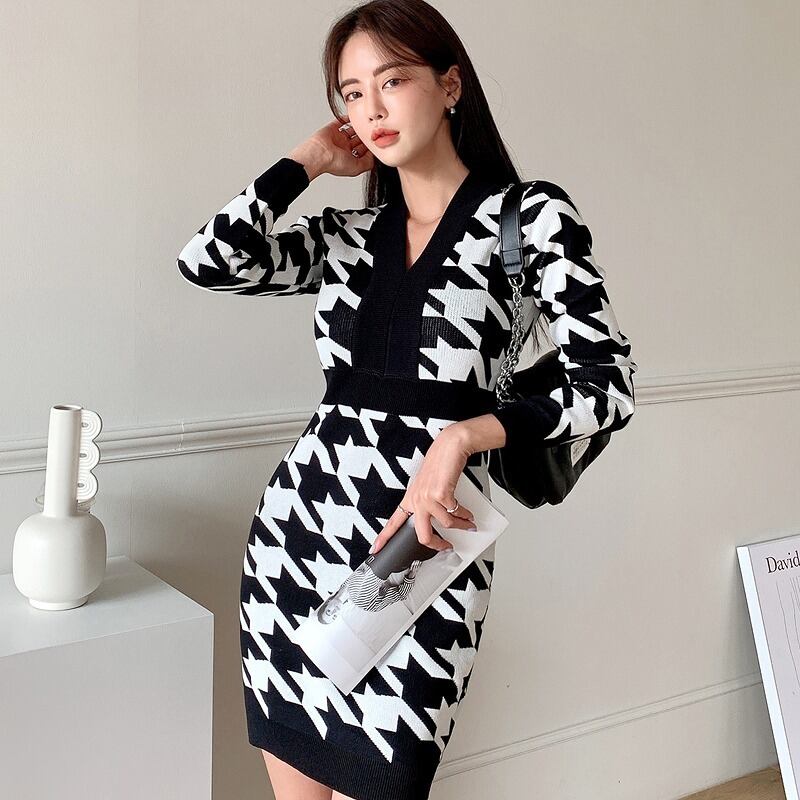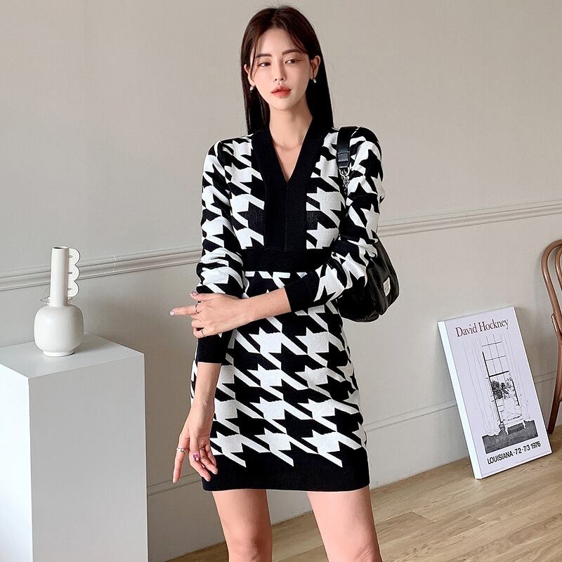 ニットワンピース 厚手 切り替え スリム 着痩せ バイカラー カットソー 千鳥柄 シンプル カットソー 羽織り 配色 千鳥格子柄