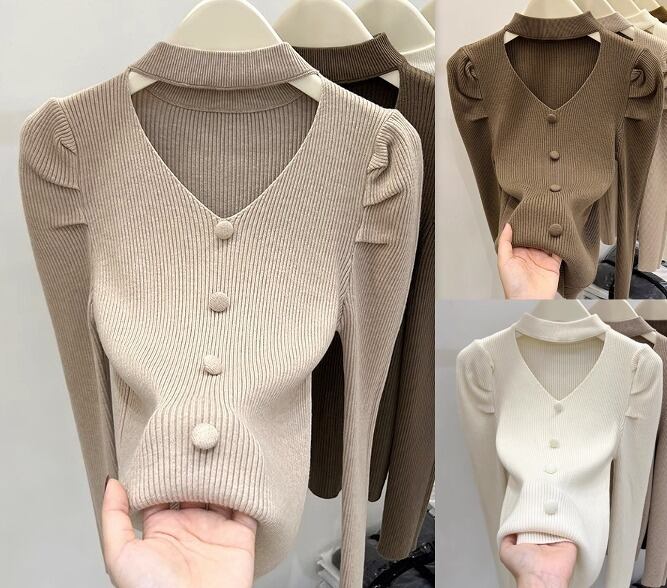ニット ボリューム袖 長袖 スリム 着痩せ カットソー シンプル カットソー 羽織り トップス パフスリーブ
