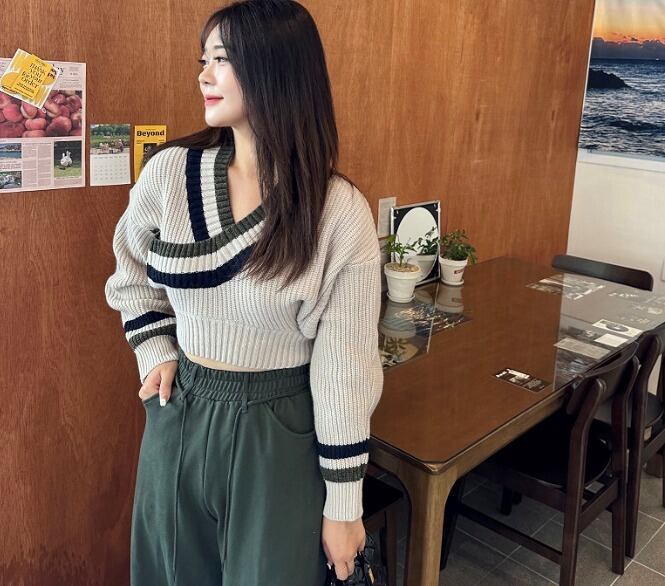 ニット 厚手 ショット丈 長袖 バイカラー 体型カバー 着痩せ カットソー カジュアル カットソー 羽織り トップス 配色