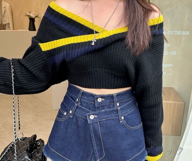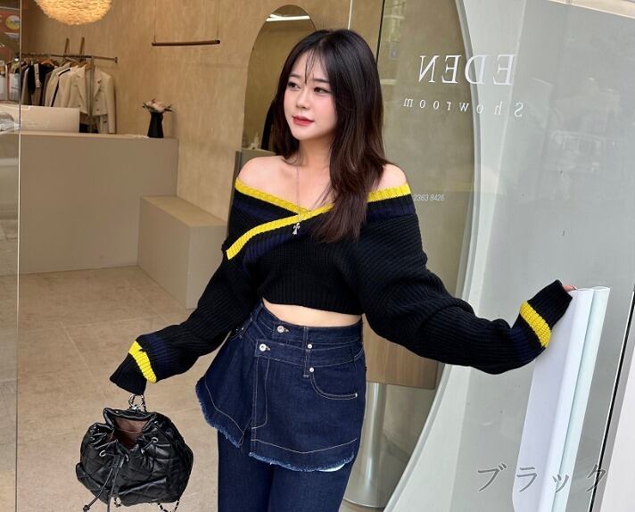 全2色 ニット 厚手 ショット丈 長袖 バイカラー 体型カバー 着痩せ カットソー カジュアル