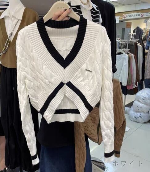 全3色 ニット 長袖 バイカラー 体型カバー 着痩せ カットソー シンプル カジュアル
