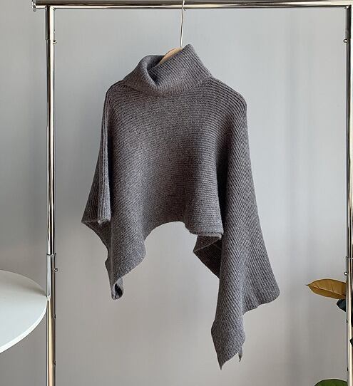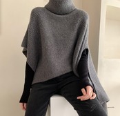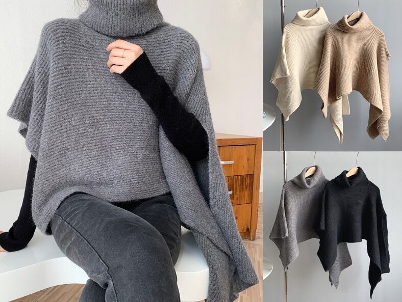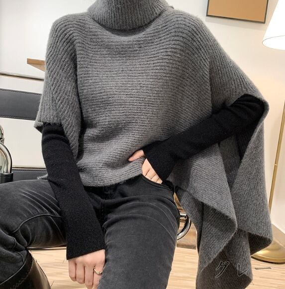 ニット アシンメトリー ポンチョ風 体型カバー 着痩せ ハイネック カットソー シンプル カジュアル カットソー 羽織り トップス 不規則 タートルネック