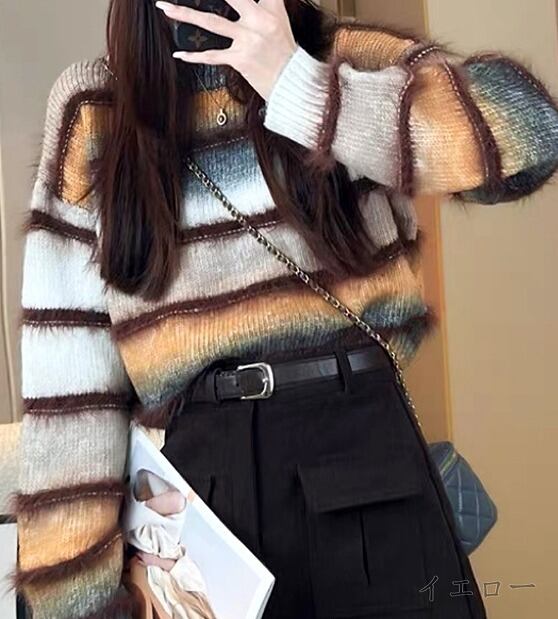 ニット 厚手 長袖 バイカラー 体型カバー 着痩せ カジュアル カットソー 羽織り トップス 配色