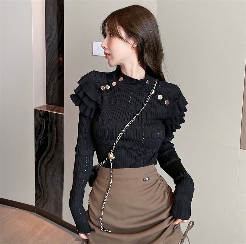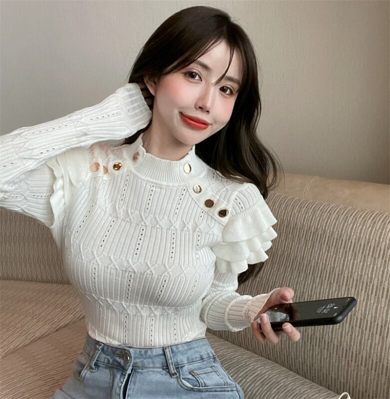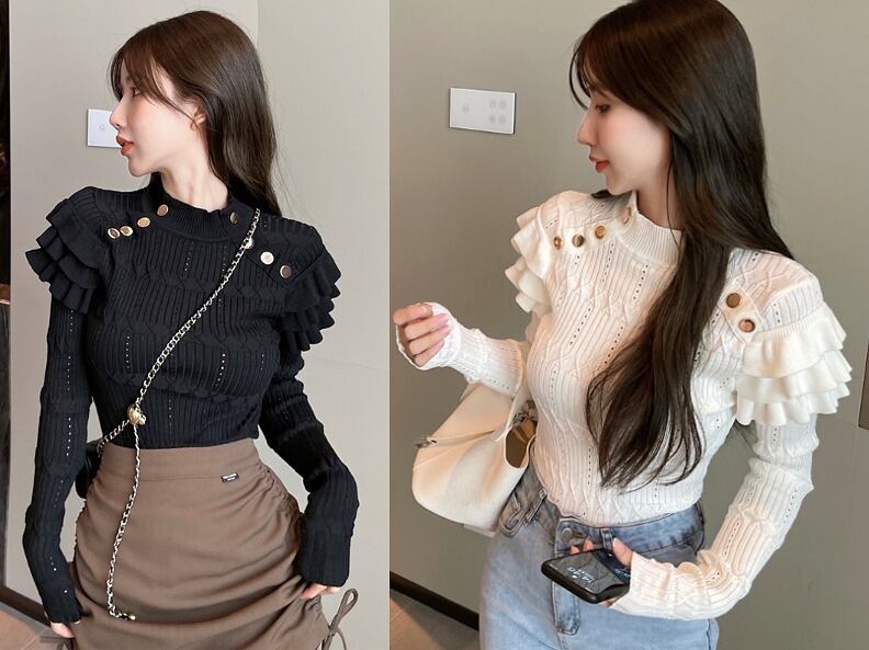 全2色 ニット 厚手 長袖 フリル 切り替え スリム 着痩せ カットソー sweet系