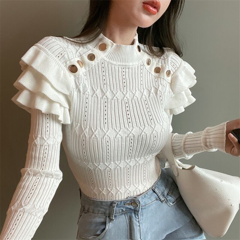 ニット 厚手 長袖 フリル 切り替え スリム 着痩せ カットソー sweet系 カットソー 羽織り トップス