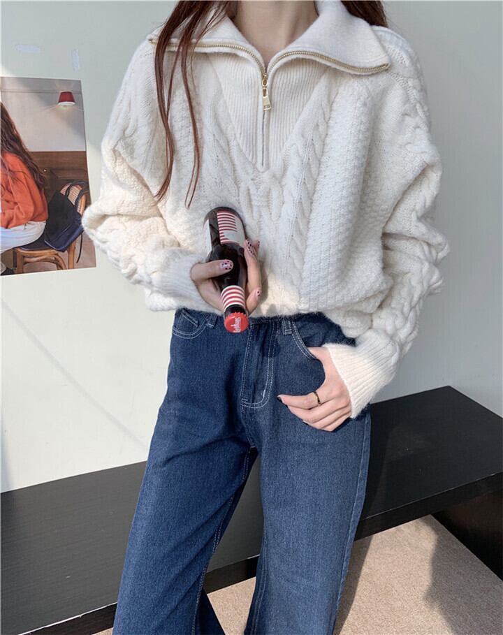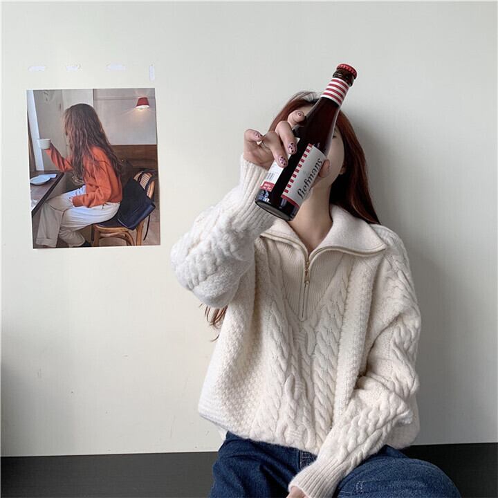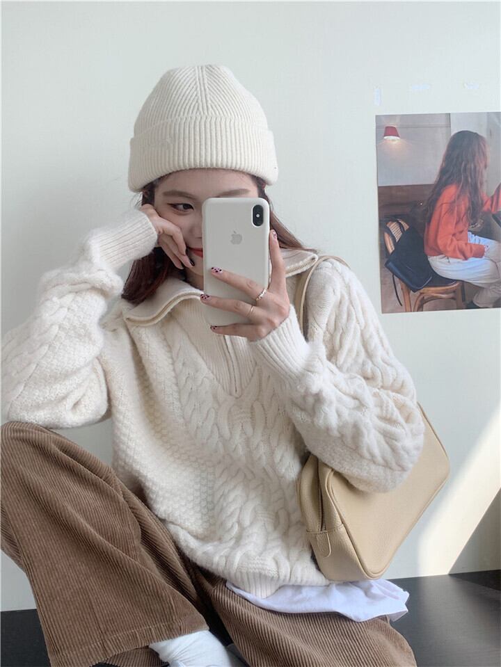 厚手 ニット ジッパー 麻の花 セーター タートルネック ゆったりする 怠惰な風 秋 冬 おしゃれな